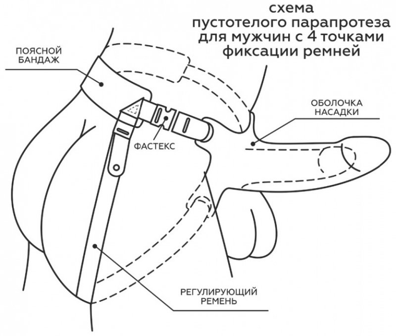Каркас (пустотелый фаллопротез) для мужчин имеет четыре кожаных ремешка для закрепления на теле. Снизу два из них обходят мошонку или прикрепляются к полимерной имитации яичек, которая накрывает мошонку сверху. Сверху стропы создают пояс на талии. Пластмассовые регуляторы позволяют расширить диапазон регулировки в талии до 180 см. На пояснице, сзади сделан небольшой бандаж, обеспечивающий удобство при носке.