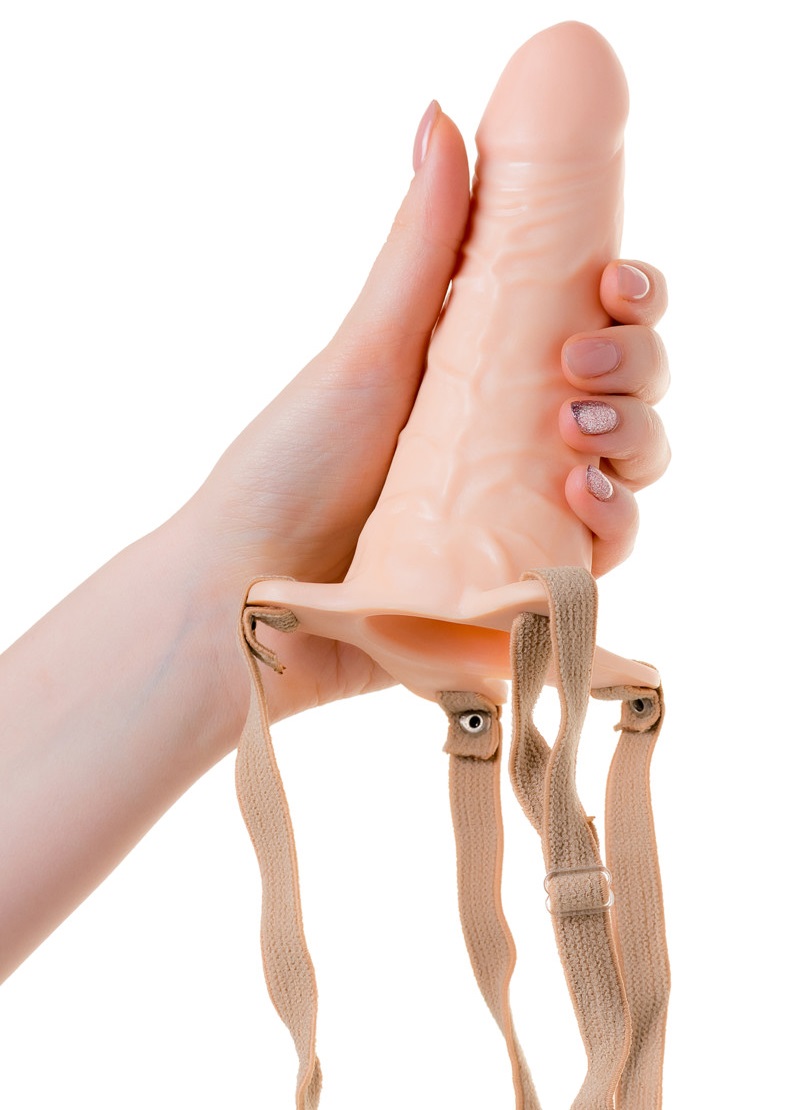 Пустотелый фаллопротез телесного цвета с регулируемыми ремешками. Ствол фаллоса имеет выраженную головку и прорисованные вены для дополнительной стимуляции.