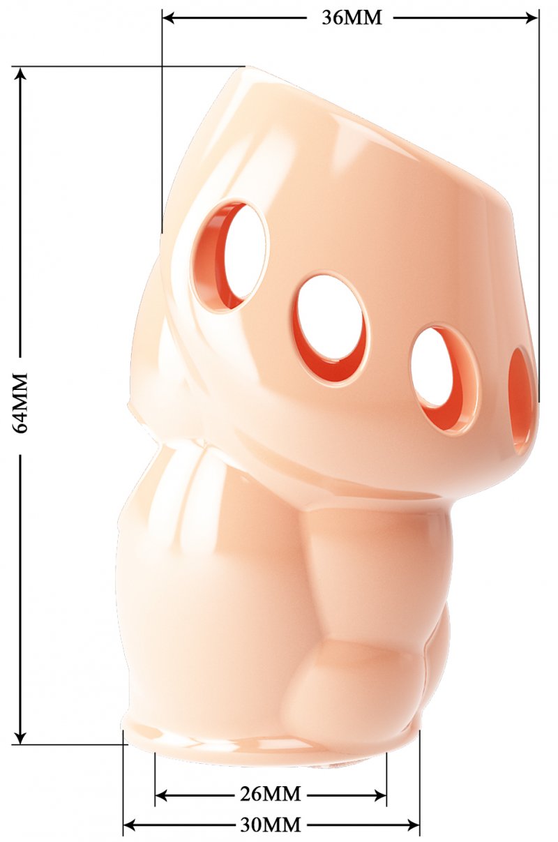 Размеры: общая длина 6,4 см, максимальный внешний диаметр для головки в нерастянутом состоянии 3,6 см, внутренний диаметр на входе 2,6 см, внешний диаметр на входе 3 см