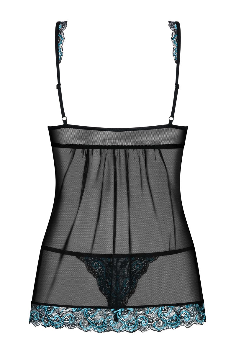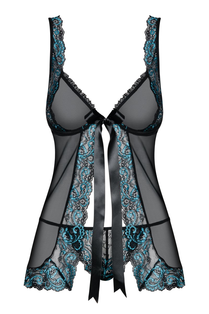 Детали: открытый животик, регулируемые лямки обеспечивают идеальную посадку, чашечки на косточках оторочены резинкой - отлично ложатся на бюст, удобная застежка и атласные ленты между чашками - легко надевать и так же легко снимать, дополнительная резинка на линии груди - идеально прилегает к телу, края сорочки украшены красивым кружевом, сексуальные, кружевные стринги в тон сорочке, воздушная, эластичная ткань.