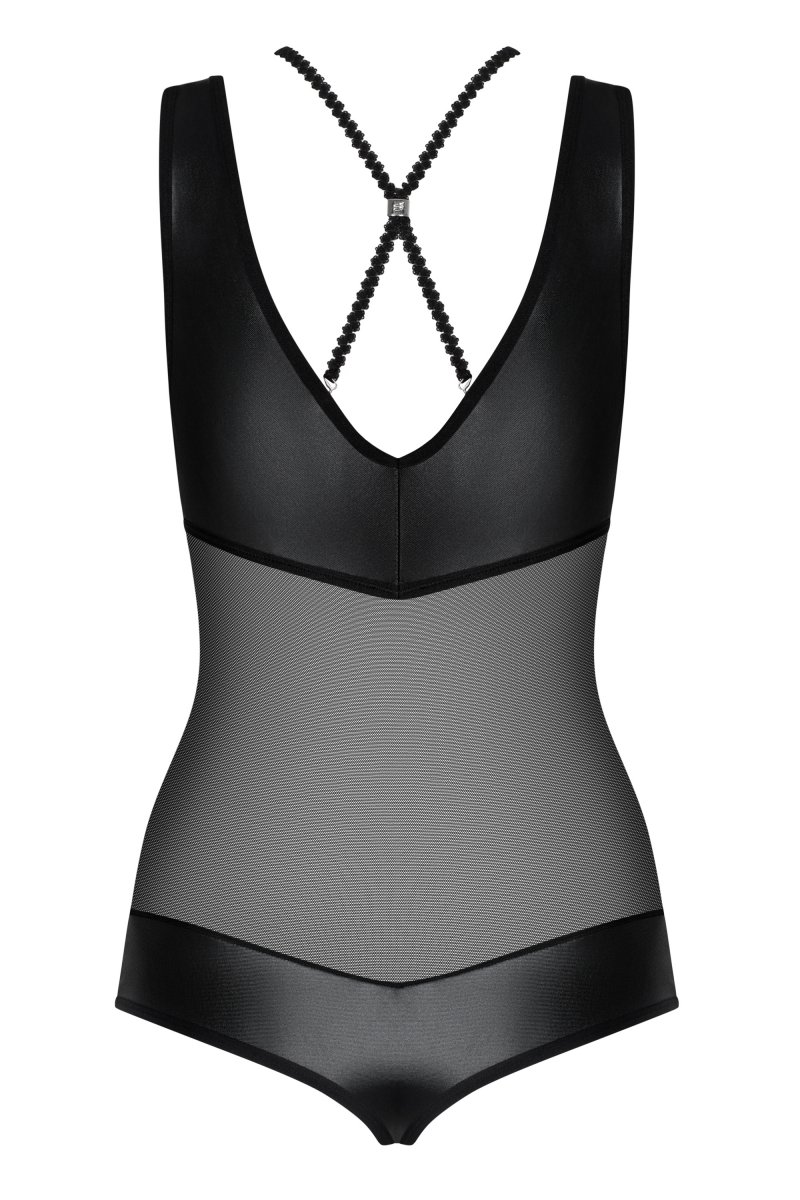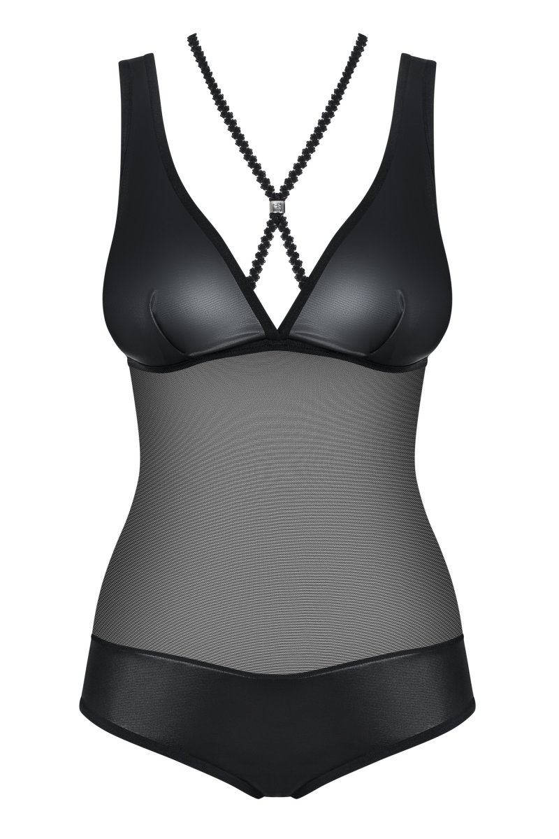 Детали: боди с добавлением блестящего материала - сексуальный «Wet Look», интригующие полоски, пересекающие декольте и спинку, серебряные украшения на стыке полос, специальная строчка на груди - визуально делает форму груди соблазнительнее, прозрачная черная сеточка - эротично подчеркнет животик и спинку, красивая, нежная, идеально эластичная ткань Multistretch.