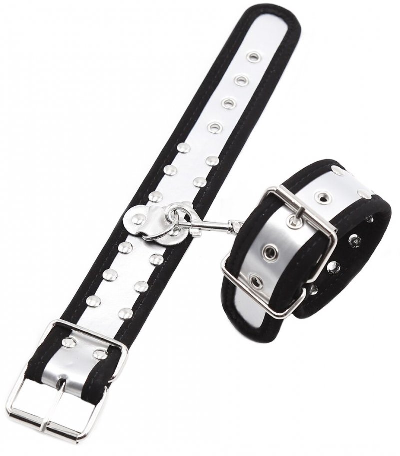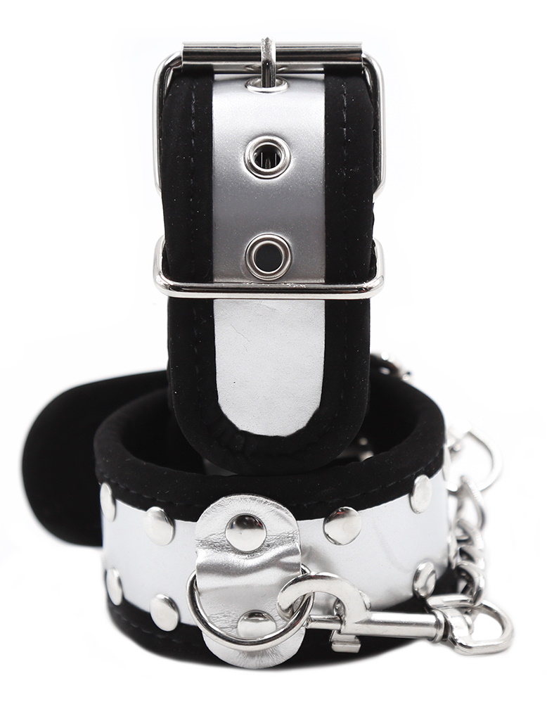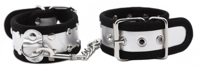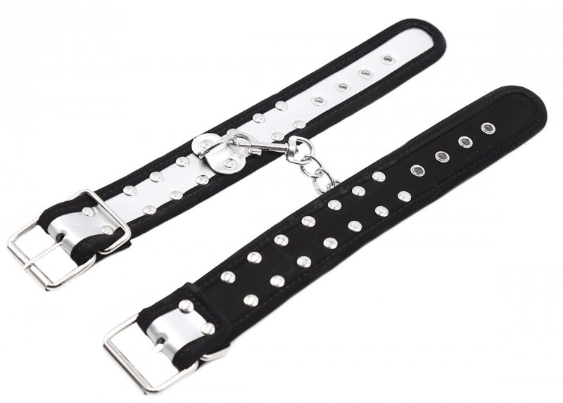 Металлическая фурнитура обеспечивает качественную фиксацию. Наручники соединяются между собой цепью с карабинами, благодаря чему обеспечивается достаточно жесткая сцепка.