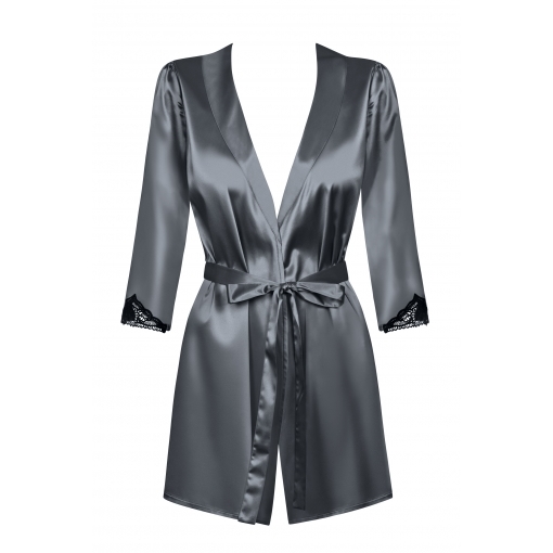 Этот короткий пеньюар завязывается на талии с помощью широкого пояса, а рукава 3/4 украшены гипюровыми вставками черного цвета.