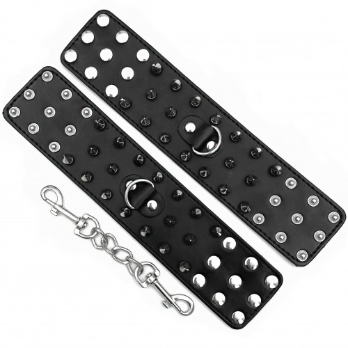 Металлическая фурнитура обеспечивает качественную фиксацию. Наручники соединяются между собой цепью с карабинами, благодаря чему обеспечивается достаточно жесткая сцепка.