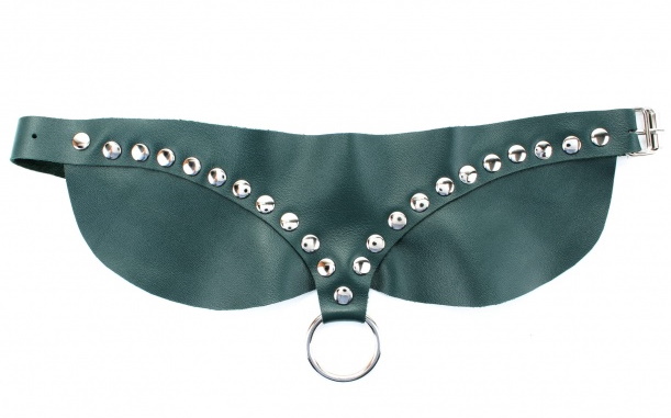 Ошейник выполнен из натуральной кожи изумрудного цвета, декорирован заклепками в виде и металлическим кольцом спереди.