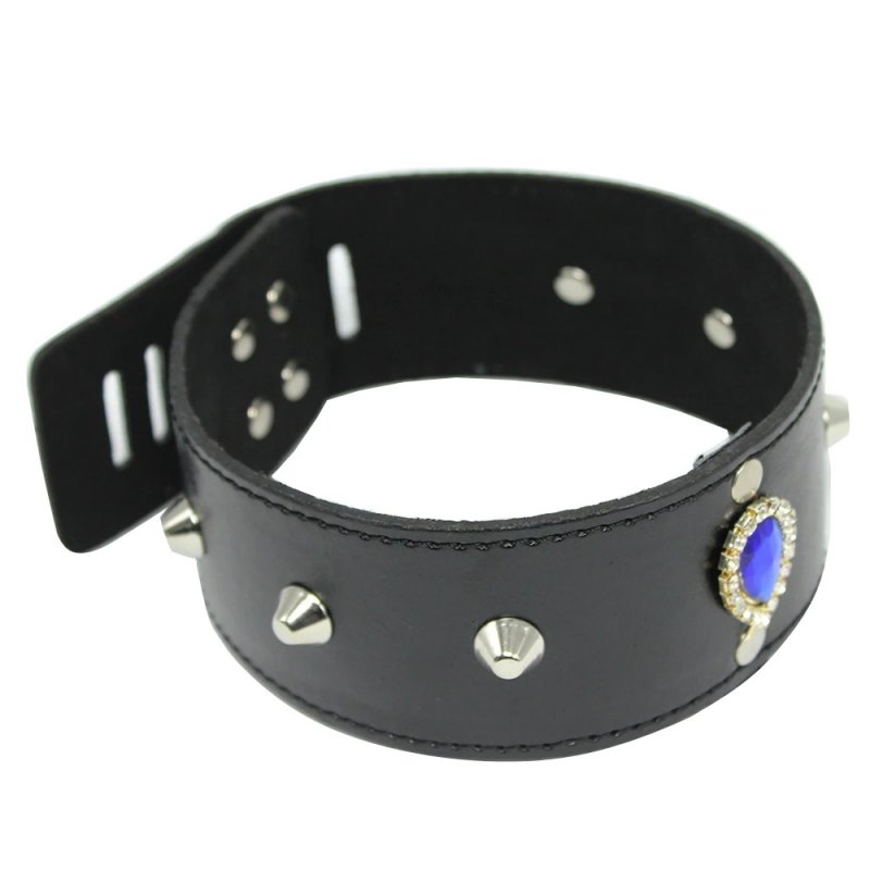 Красивый БДСМ ошейник с кольцом для поводка декорированный синим стразом, регулируется по объему при помощи крепления с замочком, расположенного сзади, также в комплекте имеется поводок-цепочка.