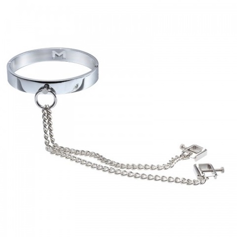 На ошейнике металлическое кольцо, от которого идут квадратные зажимы на соски, которые регулируются с помощью железного шурупчика. Выбирайте сами силу сжатия или доверьтесь в этом деле партнеру (партнерше) — главное, чтобы Вам это доставляло удовольствие…