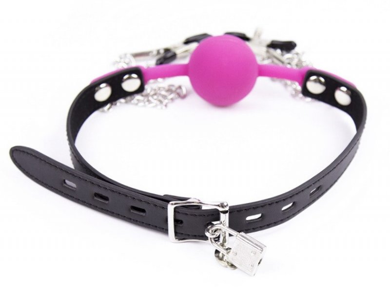 Кляп невозможно выплюнуть, он надежно фиксируется при помощи ремешка, который регулируется с помощью пряжки и фиксируется замочком.