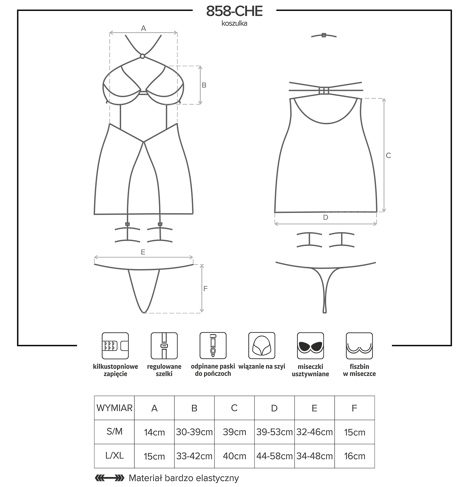 Детали: смелое сочетание прозрачной сетки и полосок на бедрах, имеется застежка на шее, чашечки с частично мягкой подкладкой на косточках, соблазнительно подчеркивающие грудь, регулируемые бретели на шее и многоступенчатая регулируемая застежка на спине, обеспечивающие идеальную посадку, своеобразный крой - полоски, соединяющие верхнюю и нижнюю части сорочки, сексуальные браслеты на руки, съемные подвязки с двойной полосой вокруг бедер - чрезвычайно чувственный аксессуар, приятная на ощупь и идеально эластичная ткань.