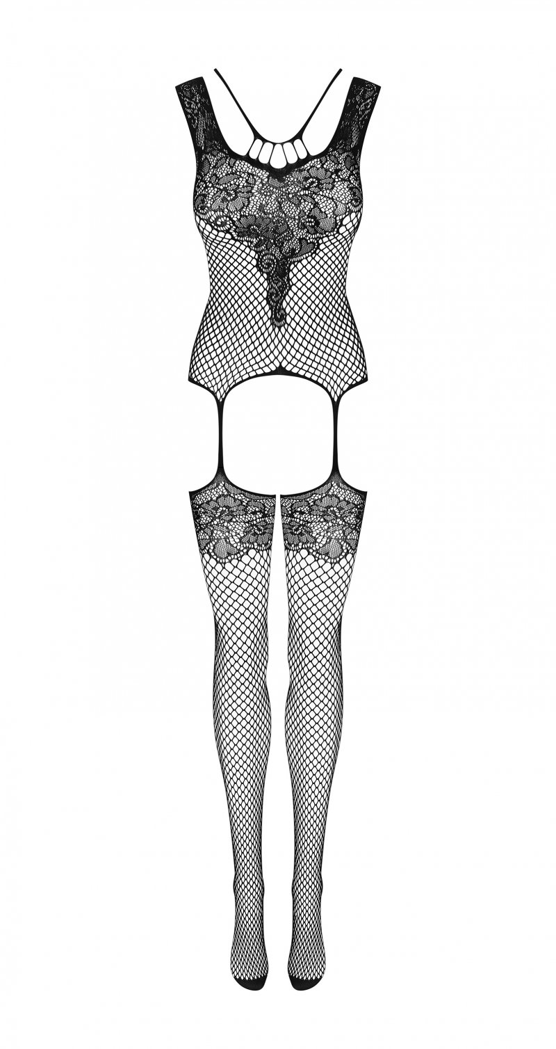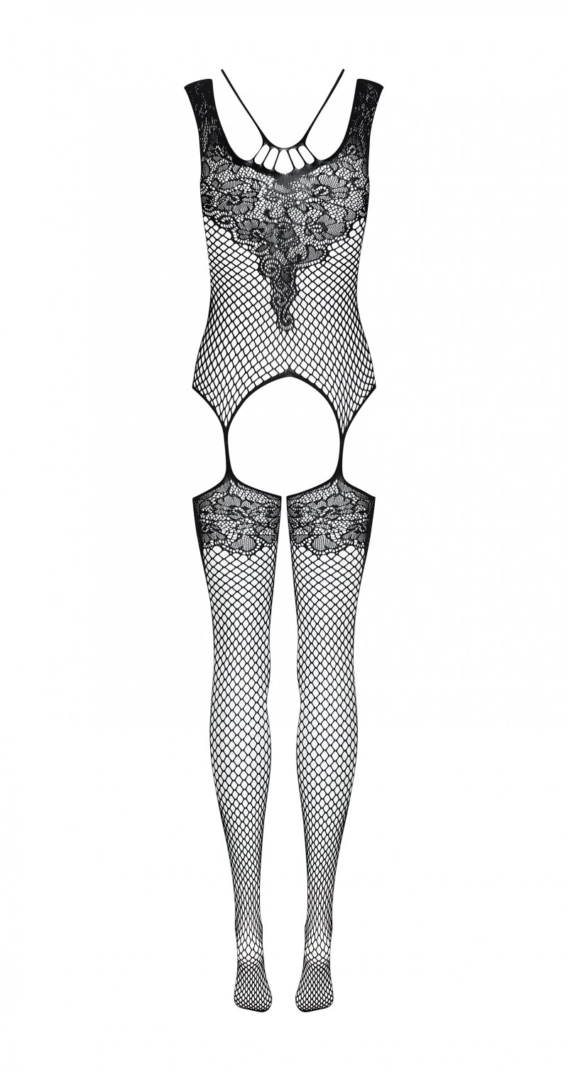 Детали: манящий боди-комбинезон с цветочным узором, широкие рукава и полоски украшают плечи и декольте, оптически стройнящий узор украшает бюст и спину, более крупные люверсы раскрывают талию и подчеркивают достоинства фигуры, открытая промежность и подчеркнутые ягодицы - лакомство для настоящей соблазнительницы, украшения на бедрах, имитирующие чулки и пояс для чулок, эластичный и идеально облегающий трикотаж - Multistretch.