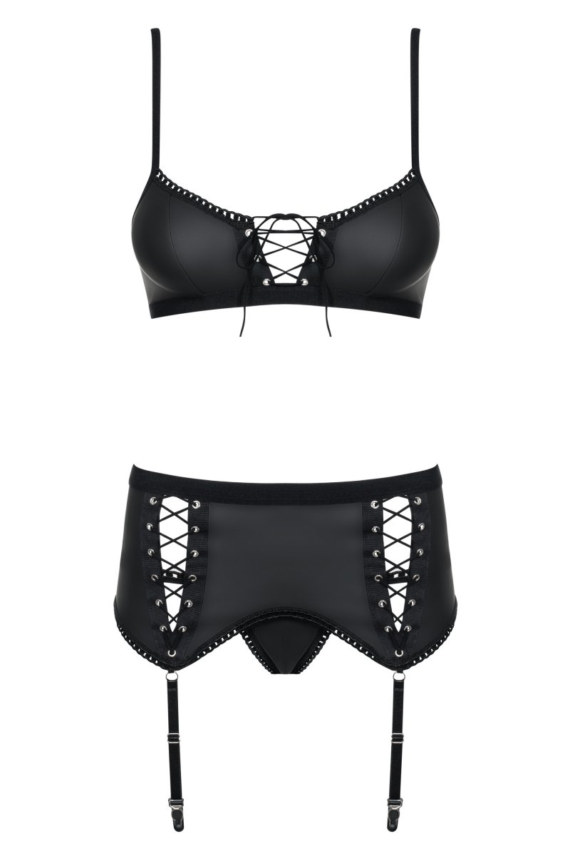 В комплект входят бюстгальтер, пояс для чулок и стринги.