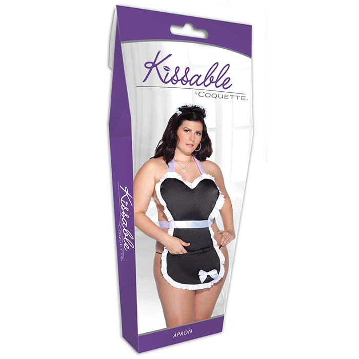 Фартук окантован белой рюшей. Завязывается на шее и на поясе атласными ленточками белого цвета.