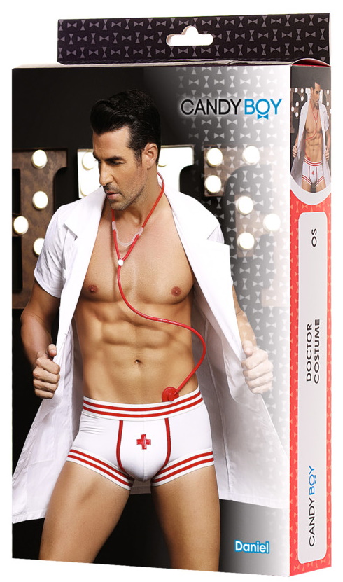 Слегка приталенный силуэт халата добавит стройности фигуре. Эластичные боксеры с контрастной отделкой, на широких резинках. Пластмассовый стетоскоп входит в комплект.