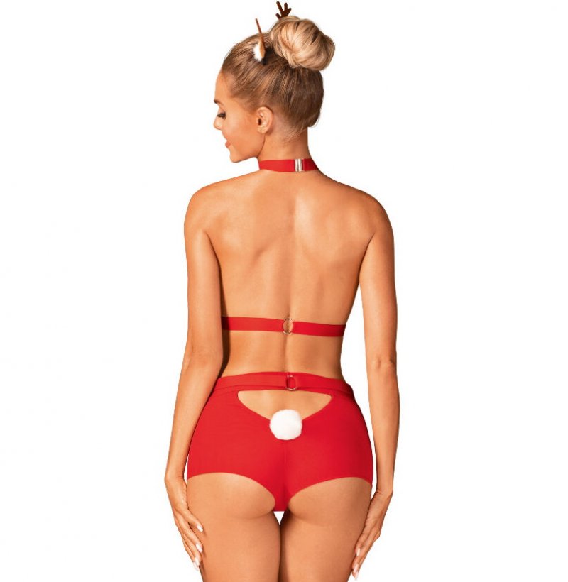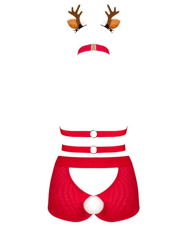 Соблазнительный крой и чрезвычайно пикантные элементы: переплетение стрепов, высокие трусики-шорты и заколочки на голову с милыми ушками - все это создаст игривый наряд в праздничной атмосфере.