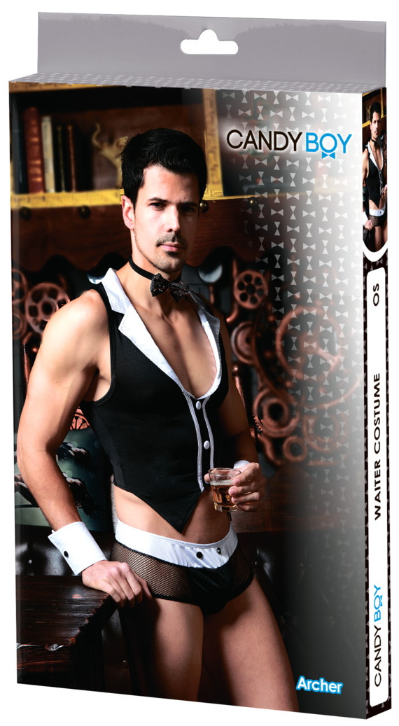 Трусы-боксеры из эластичной сетки обеспечат идеальный обзор сзади. Галстук-бабочка на застежке «липучка» и манжеты на кнопках дополнят образ.