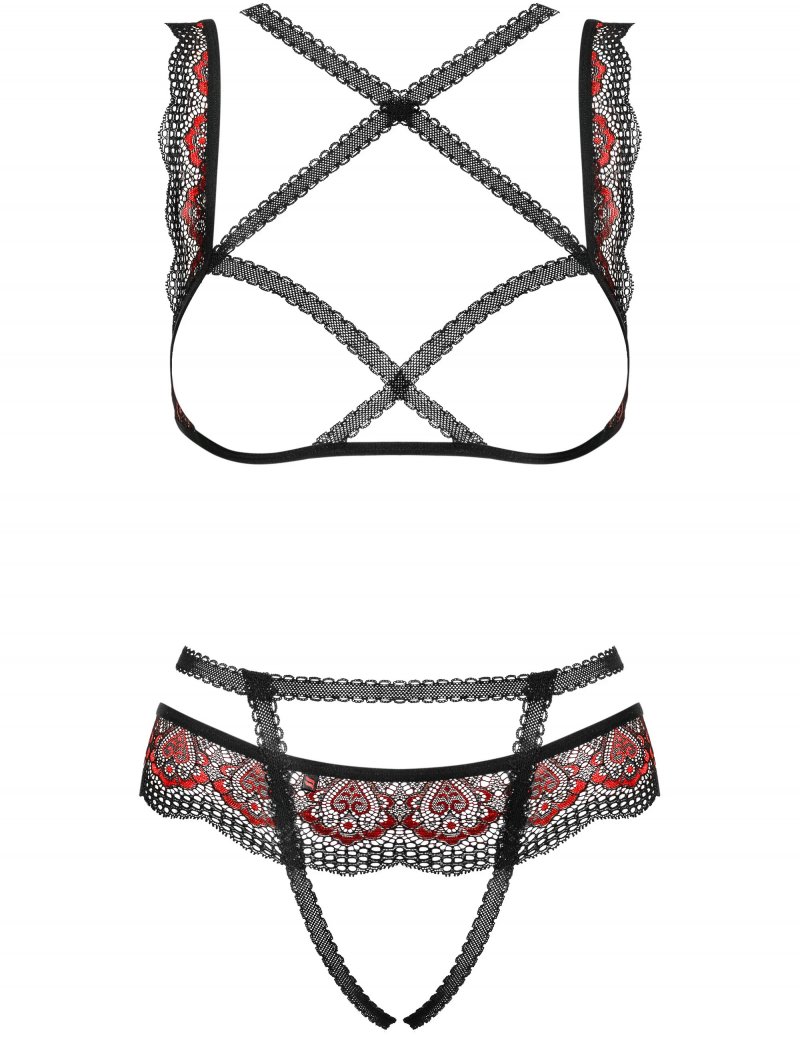 Детали: открытый комплект Megies выполнен из кружева черного и красного цветов, открытый бюстгальтер с кружевом - добавит пикантности, декорированные кружевом регулируемые бретельки и застежка обеспечат идеальную посадку, кружевные трусики-стринги с открытой промежностью - залог острых ощущений и красивого вида ягодиц, эластичная и мягкая ткань Multistretch.