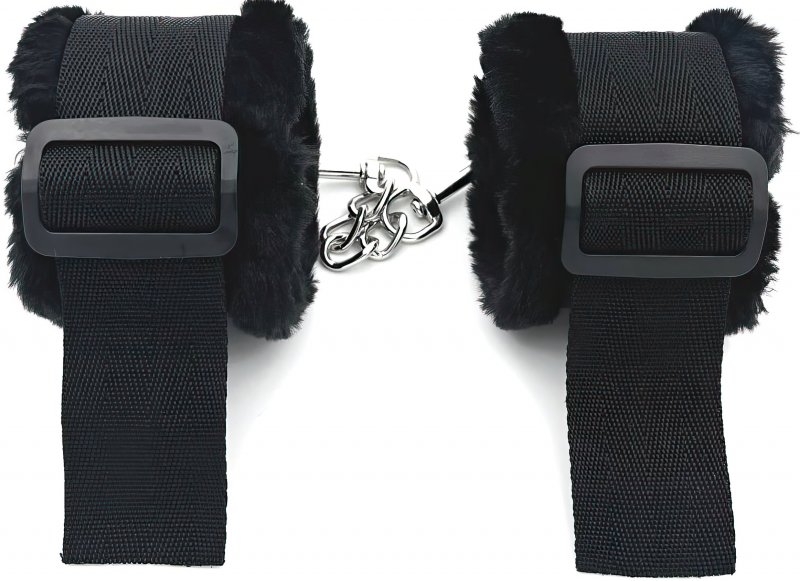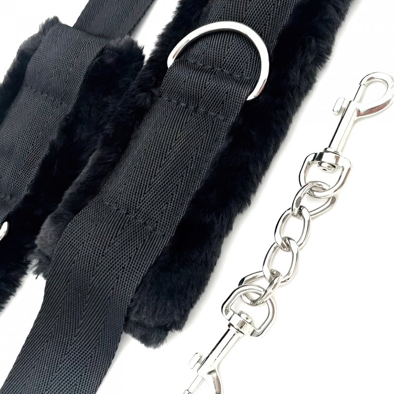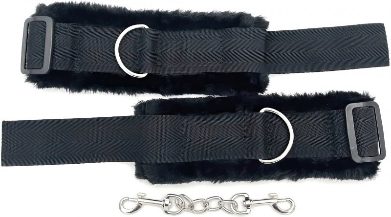Наручники не при­чи­нят боли, так как их внутренняя сторона отделана мягким мехом. Соединяются между собой цепочкой с двумя карабинами на концах.
