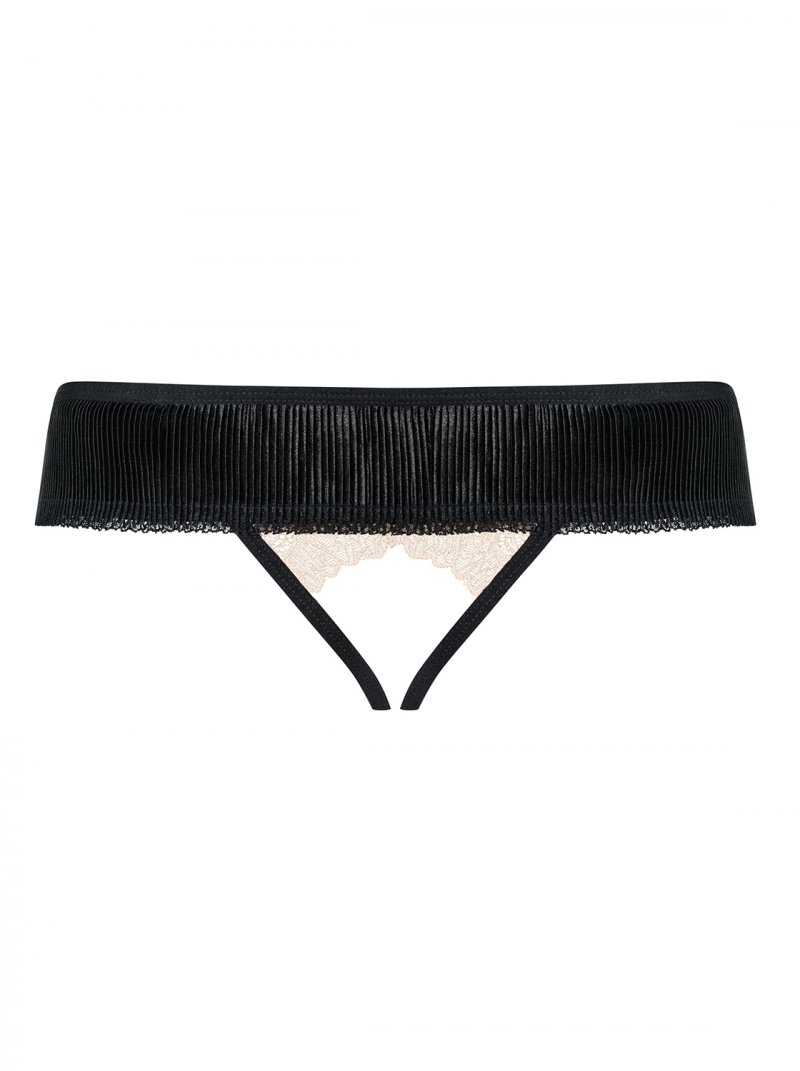 Пикантные стринги с открытой промежностью выполнены из приятной на ощупь и эластичной ткани, декорированы бежевым кружевом.