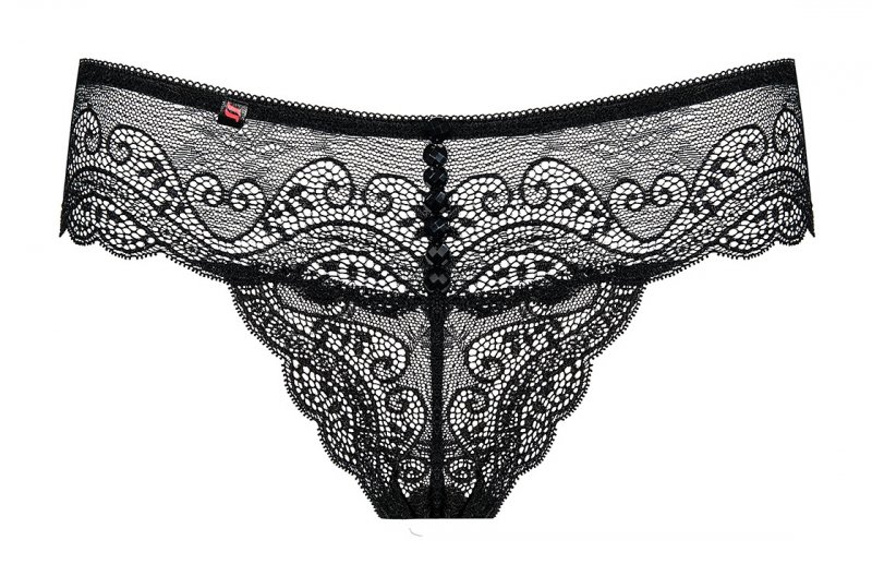 Трусики выполнены из кружевной ткани. Спереди вертикальной линией пришиты черные стразы.