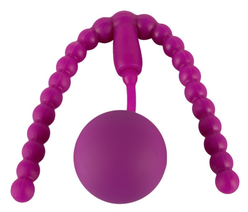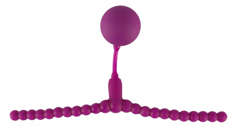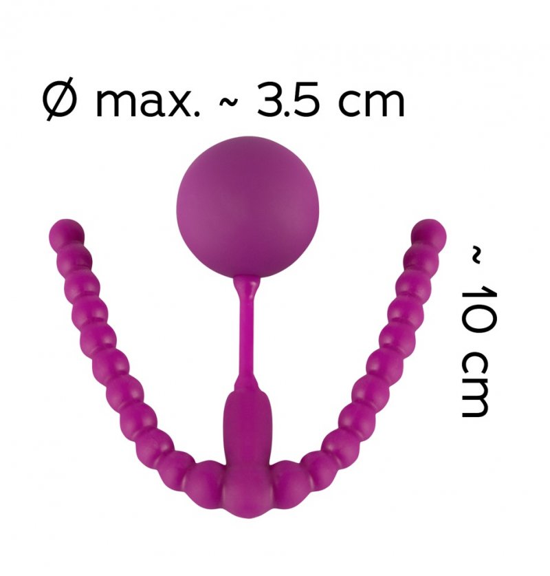 Силиконовый шарик диаметром 3,5 см. имеет подвижный центр тяжести, который усиливает ощущения и обеспечивает более полноценную нагрузку. К нему прикреплен эластичный шнур с двумя цепочками из множества бусинок, которые раздвигают половые губы, в то время как аксессуар находится внутри тела.