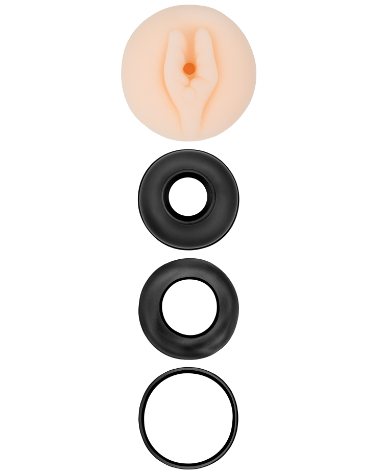 В комплекте четыре сменные насадки из мягкого TPE, каждая с разным диаметром, что позволяет индивидуально подобрать плотность прилегания. Одна из насадок выполнена в реалистичном дизайне, что дает возможность использовать устройство как мастурбатор, добавляя еще больше удовольствия.