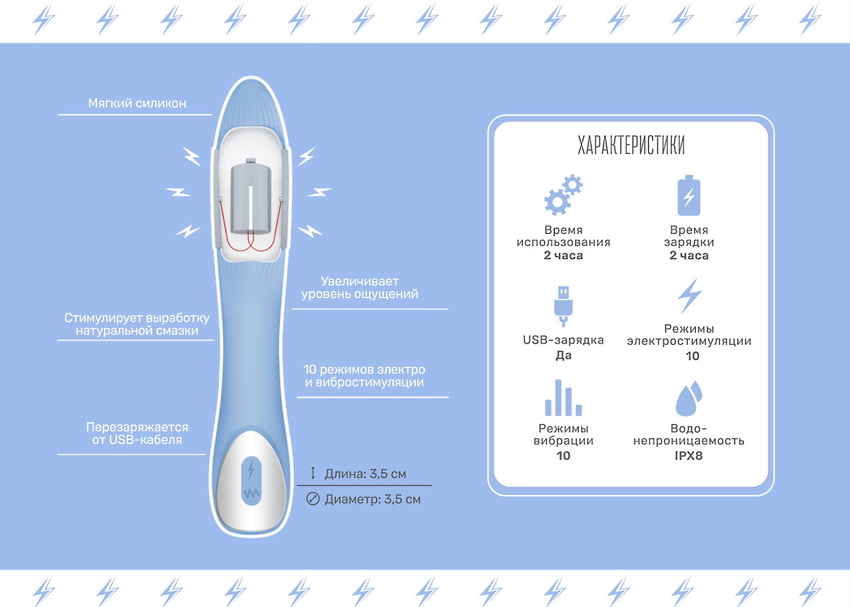 Игрушка оснащена 10 функциями вибрации и 10 режимами электростимуляции.